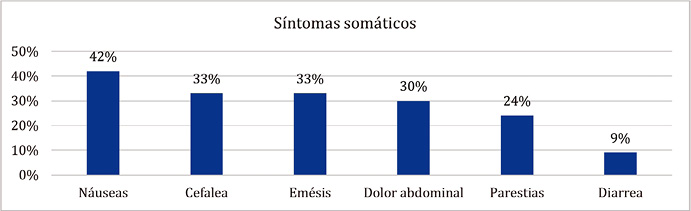 Al evaluar síntomas somáticos se encontró como el más prevalente las náuseas presentándose en el 42% de los pacientes, seguido por cefalea y emesis en el 33% (Figura 3).