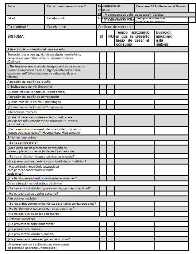 La palabra Basuco significa base de cocaína, es una sustancia psicoactiva (SPA) derivada de las hojas de la planta Erithroxylon Coca (EC) oriunda de países andinos como Bolivia, Perú, Colombia y Ecuador [1]. Actualmente no hay estudios en la literatura científica que describan la sintomatología que genera su consumo ni su síndrome de abstinencia (SA) por lo cual los clínicos manejan estas situaciones de forma similar a como se realiza con la cocaína que es una sustancia psicoactiva también derivada de EC, pero con una preparación diferente.