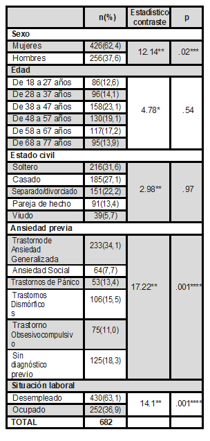 Existe una importante cantidad de personas que han realizado una tentativa de suicidio que no presentaban diagnóstico previo de salud mental (125-18,3%) o que presentaban previamente un trastorno de ansiedad generalizada (233-34,1), con diferencias en esta variable en la muestra (χ2 = 17,22; p<0,05). También existe una importante cantidad de personas en situación de desempleo (430-63,1%), con diferencias en este aspecto (χ2 = 14,01; p<0,05).