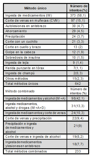 Respecto a los métodos empleados para la tentativa suicida, los resultados muestran que los métodos únicos (642-73,4%) fueron más frecuentes que los métodos combinados (233-26,6%) (Tabla 2). Se detecta una relación significativa entre el método utilizado para el intento y el sexo (RV(3)= 14,731; p= 0,02). La ingesta de tóxicos (fármacos, líquidos no aptos para la ingesta o pesticidas) se convierte en el método de suicidio más frecuentemente elegido por las mujeres (60,25%), frente a la precipitación y golpes, utilizado por una gran mayoría de hombres (75%).