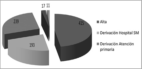Respecto al número de tentativas suicidas repetidas (reintentos), es decir, personas que han presentado más de un intento de suicidio, los datos recogidos reportan 322 tentativas de suicidio repetidas durante el periodo de estudio, realizadas por 128 personas diferentes (19% sobre el total) (Tabla 3). En cuanto al tipo de actuación sanitaria (Figura 1) sobre el paciente que realiza una tentativa suicida, del total de las tentativas suicidas (876 tentativas) a un 47,42% (415) se les da el alta en el servicio de urgencias. Un 22,1% (193) sobre el total de tentativas suicidas fueron valorados como más graves de lo habitual y se derivaron, según su lugar de nacimiento al hospital con servicio especializados de Salud Mental más cercano de su lugar de residencia, para su ingreso. Se observa una relación significativa entre el tipo de actuación sanitaria que se realiza tras el intento y el método utilizado para el suicidio (RV(12)= 20,603; p= 0,05). Así, a más de la mitad de las personas que han intentado suicidarse utilizando la ingesta de tóxicos (fármacos, líquidos no aptos para la ingesta o pesticidas) o la autolesión, se les da el alta (57,10%). Sin embargo, cuando el método de intento es la precipitación y golpes o la combinación de varios métodos, las personas suelen ser derivadas al centro hospitalario con servicio especializado en salud mental (41,66% precipitación y golpes y 60% combinación de varios).