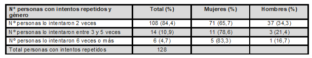 Resumen: Objetivo: esta investigación pretende estudiar las variables epidemiológicas relacionadas con la tentativa y el reintento de suicidio y si entre ellas los trastornos de ansiedad son importantes. En la conducta suicida existen fases previas menos investigadas que son altamente predictivas del suicidio consumado, como son los intentos o reintentos de suicidio.Materiales y métodos: consistió en recoger datos digitales en los servicios de urgencias hospitalarias durante 26 meses. Resultados: los resultados obtenidos por un proceso de regresión logística binaria muestran que el grupo de personas que han realizado más de una tentativa de suicidio son mujeres (β =0,36; OR=2,70; I.C. 95%), entre 34 y 53 años de edad (β =0,31; OR=6,99; I.C. 95%), desempleadas (β =0,43; OR=4,98; I.C. 95%), con trastorno de ansiedad previo (β =0,83; OR=3,95; I.C. 95%), que utilizan métodos únicos (β =0,23; OR=4,72; I.C. 95%) y que suelen darle el alta en los servicios sanitarios de urgencias (β =0,42; OR=6,89; I.C. 95%). Conclusiones:se discute la necesidad de realizar protocolos sanitarios específicos para la prevención de la tentativa de suicida adaptados a las características psicosociales y clínicas de este colectivo, mejorando a su vez las actuaciones sanitarias de urgencia existentes para los reintentos de suicidio como prevención del suicidio consumado.