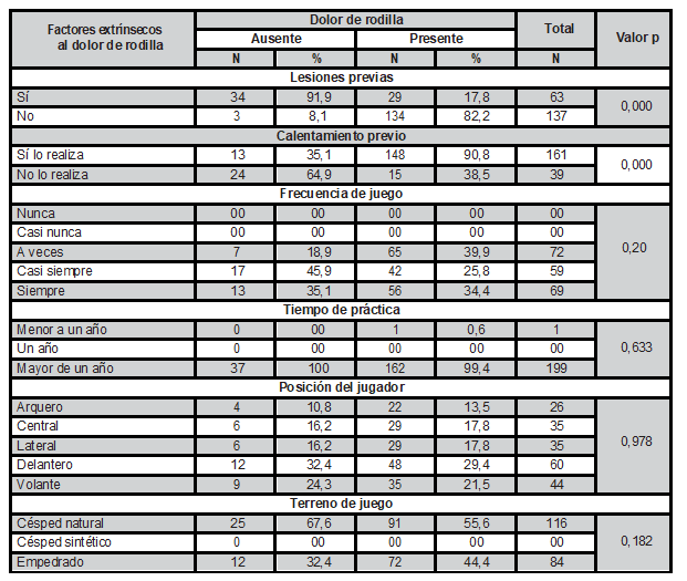 Acerca de los factores extrínsecos del dolor de rodilla, los resultados estadísticamente significativos son los siguientes: las lesiones previas (p=0,000) y el calentamiento previo (0,000); en cambio, las variables tales como frecuencia de juego, tiempo de práctica posición del jugador y terreno demostraron una relación no estadísticamente significativa (ver tabla 2).