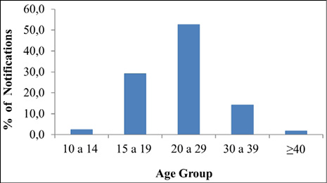 Regarding the age group, the data showed a normal distribution (p-value = 0.1297> 0.05) and the graphic analysis confirms this behavior given the decrease on both sides and the lower trend of extreme values (Figure 2). The age group that concentrated most records was 20 to 29 years old, with 52.6%, and subsequently, the age group 15 to 19 years old presented 29.1% of the total cases. In addition, the average age of notifications was approximately 24 years old, featuring a sample of young women. In this variable, there were no ignored cases.