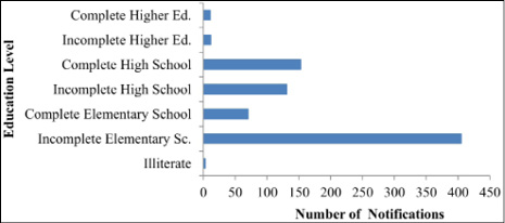Regarding education, there were 17.3% of ignored records, which in absolute terms, represents 164 patients who did not have their education level added to the platform during the analysis period. However, of the total number of notifications, 42.7% of pregnant women with syphilis did not have completed elementary school, while 1.2% had completed higher education (Figure 3).