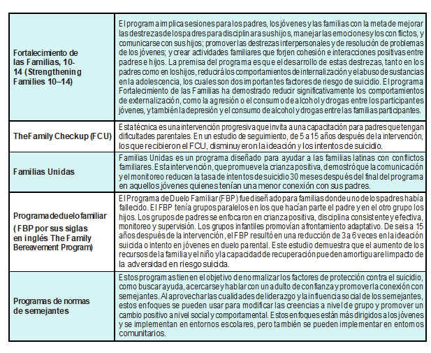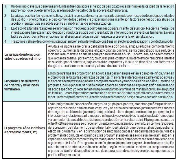 Actualmente existen programas de intervenciones preventivas en la familia basados en la evidencia para reducir el riesgo de maltrato infantil, y por ende las experiencias adversas en la infancia, lo que encamina a la reducción del riesgo de suicidio en niños y adolescentes. Un punto clave que influye sobre el riesgo de psicopatología del niño es la calidad de la relación padre-hijo. Existen intervenciones centradas en la formación de los padres, con programas de crianza que han demostrado reducir la tasa de maltrato infantil en diferentes comunidades (Ver Tabla 1, tabla 1b) [16,17,18].