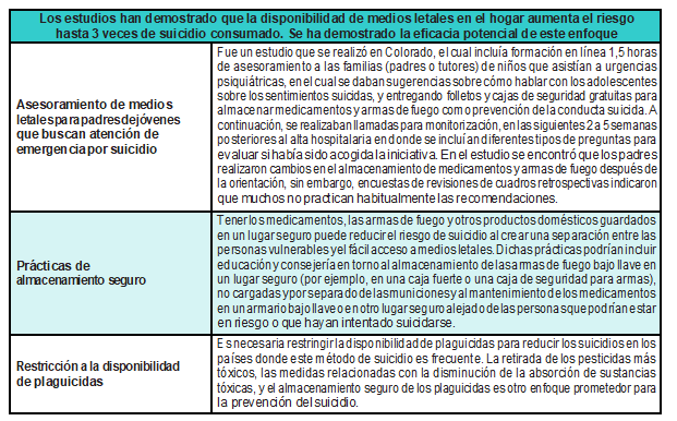 Otro punto importante es aconsejar a las familias sobre la seguridad de los medicamentos, armas de fuego y plaguicidas, es decir, el asesoramiento sobre medios letales, para así, reducir la exposición de los niños y adolescentes a elementos utilizados para llevar a cabo el suicidio, los cuales se describirán en la Tabla 2 [17,19,21].