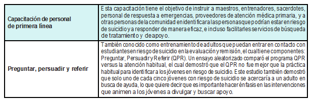 Es importante que se eduque al personal sanitario de APS sobre las estrategias de prevención del suicidio en niños y adolescentes desde la atención médica y el entorno familiar, escolar y comunitario, para que se aprenda a potencializar los factores protectores y responder a las señales de alerta de riesgo de suicidio. Para eso, en la literatura existe una gran cantidad de intervenciones preventivas realizadas mediante estrategias y programas que ayudan a disminuir los pensamientos e intentos de suicidio, que demuestran reducir a corto y largo plazo el riesgo de suicidio en niños y adolescentes. Aunque, muchas de estas intervenciones han sido aplicadas en pocos países, han demostrado tener resultados significativos independiente de raza, sexo y grupo etario.