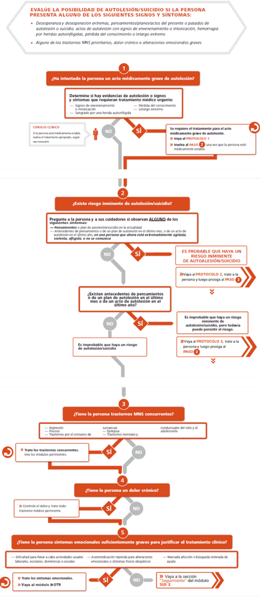 A toda persona mayor de 10 años de edad que presente alguna de las siguientes afecciones se les debe preguntar acerca de pensamientos o planes de autolesión en el último mes, y sobre actos de autolesión en el último año: depresión, psicosis, epilepsia, dolor crónico, alteraciones emocionales agudas [1] (ver Figura 2). Así se pueden identificar síntomas de diferentes enfermedades mentales o ideación suicida y realizar intervención preventiva; al identificar el riesgo se debe estar en la capacidad de evaluarlo remitir para la valoración especializada, y así determinar su grado y optar por el manejo ambulatorio u hospitalario [16]