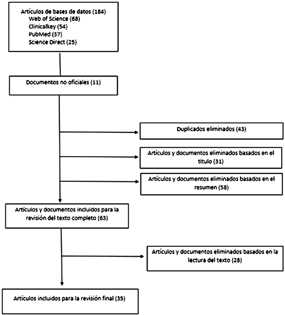 Luego del análisis de contenido de cada uno, se escogieron 35 artículos y documentos para la revisión final, los cuales contenían datos relevantes de suicidio e intentos de suicidio en niños y adolescentes orientados a la prevención desde atención primaria, que incluye el contexto familiar, los contextos escolar y social, y el rol del personal de salud.