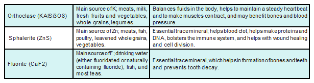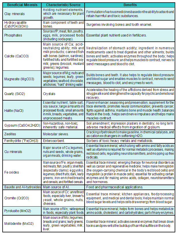 Minerals can be added in formulations of medicines, not only in their elementary form but also as inorganic or organic salts or as other chemical compounds [28]. On the other hand, individual patients might be expected to react differently to health treatments using natural means, the so-called naturotherapy, which is is a healing system using the power of nature and it is considered an art, science and philosophy [124-125]. Table 1, 1b, 1c depicted the main hazardous or beneficial minerals and their effect in health.