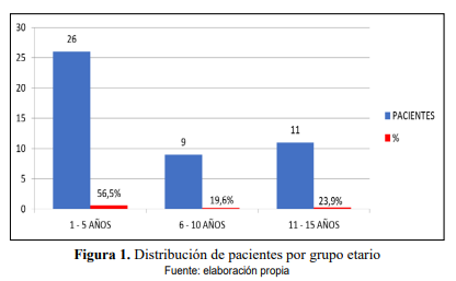 (Figura 1) correspondió al grupo de 1 a 5 años con un total de 26 pacientes (55,5%), seguido del grupo de 11 a 15 años con un total de 11 pacientes (23,9%) y finalmente el grupo de 6 a 10 años con 9 pacientes (19,6%); el rango de edad fue 1 hasta 15 años, con una edad media de 6 años, moda de 2 años y media- na de 4 años.