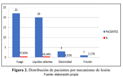 El mecanismo más frecuente causante de la lesión, fue la quemadura por fuego directo re- presentado por 22 (47,83%) pacientes, seguido de quemaduras por líquidos calientes con 20 (43,48 %) pacientes, similar a lo presentado por Cambiaso-Daniel et al [9], quienes presentaron que el mecanismo predominante de lesión en 21 de 24 (88%) pacientes fue la quemadura por fuego directo, y en contraste se puede observar lo publicado por Alemayehu et al [8] en el cual demostraron que la causa más frecuente de quemaduras fueron las producidas por líquidos calientes representado por 265 (69,4%) pacientes, seguidas de las lesiones por fuego directo que fueron 66 (17,3%) pacientes, sin embargo, es ampliamente conocido que las quemaduras por llama directa tienen una mayor tasa de mortalidad que aquellas producidas por otras causas [10].