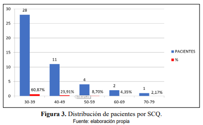 La mayoría de los pacientes que fueron ingresados en la unidad de quemados presentaron quemaduras entre 30-39% de SCQ (n = 28; 60,87%). El rango de SCQ fue de 30 hasta 70%, con un promedio de 40,7%, moda de 46% y una mediana de 38,25% (Figura 3).