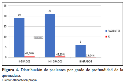 De los 46 pacientes incluidos, se observó que 21 (45,65%) pacientes presentaron que- maduras combinadas entre segundo y tercer grado, seguido de 19 (41,30%) pacientes que presentaron quemaduras de segundo grado, los 6 (13,04%) pacientes con quemaduras de tercer grado presentaron complicaciones, así como se describe en la literatura consultada [9].