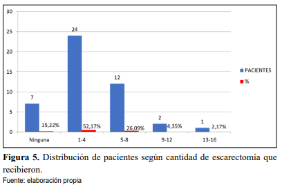 La evidencia sugiere que la remoción temprana de escaras es efectiva para disminuir la morbilidad y mejorar la tasa de mortalidad [11,12], en este estudio se observó que se le realizó escarectomía a 39 (85%) pacientes, con un promedio de 3,6 escarectomía por paciente y con un rango de 0 a 16 escarectomías.