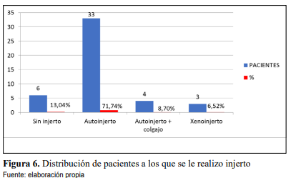 Los pacientes a los que se les trató con injerto (Figura 6) fueron 40 (87%) de los cuales 33 (71,74%) pacientes se les realizo autoinjerto, 4 (8,70%) autoinjertos combinados con colgajo,3 (6,52%) pacientes fueron tratados con xenoinjerto, y solo 6 (13,04%) pacientes no ameritaron ningún tipo de injerto.