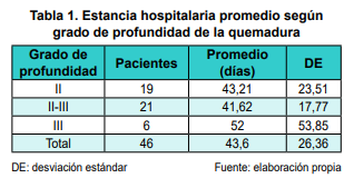 La estancia hospitalaria promedio fue de 43,6 días (rango: 2-126 días), con una moda de 70 días y una mediana de 38,5 días, y cuando asociamos la estancia hospitalaria y el grado se quemadura (Tabla 1) obtuvimos que los pacientes con quemaduras de II grado tuvieron una estancia hospitalaria promedio de 43,21 días, los que presentaron la combinación entre quemaduras de II y III grado permanecieron hospitalizados un promedio de 41,62 días y los que presentaron quemaduras de III grado permanecieron un promedio de 52 días.