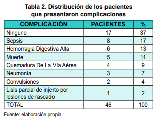 elaboración propiaLas complicaciones (Tabla 2) se presentaron en 29 (63%) pacientes y 17 (37%) no presentaron complicaciones, dentro de las complicaciones más frecuentes se encontró la sepsis asociada a la quemadura 8 (17%), y 5 (11%) pacientes fallecieron durante su estancia en el área de terapia intensiva pediátrica (UCIP).