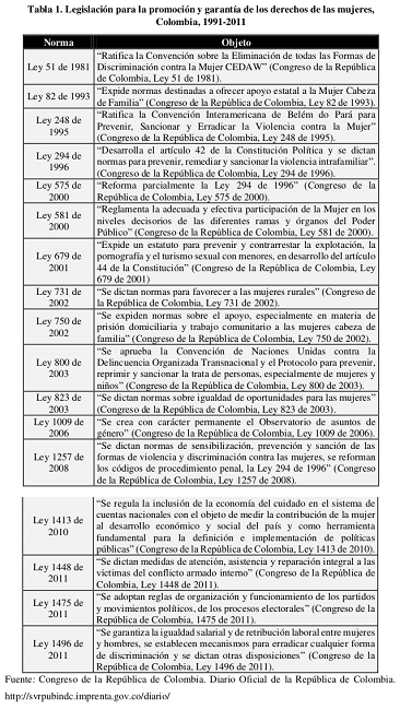 Si bien es posible identificar un amplio proceso legislativo para la promoción y garantía de los derechos de las mujeres, es necesario indicar que el diseño e implementación de políticas públicas no ha tenido el mismo ritmo y avance. El marco jurídico establece un conjunto de acciones, competencias y responsabilidades que deben materializarse a partir de estrategias nacionales y territoriales, aunque las mismas son relativamente recientes y sus alcances apenas se logran evidenciar. Es a partir de la Constitución de 1991 y la ratificación de tratados y convenios internacionales que se pueden identificar procesos de diseño de políticas para la garantía de los derechos de la mujer. Así en 1992, se “formuló la Política Integral para la Mujer; en 1994, la Política de Participación y Equidad de la Mujer; en 1999, el Plan de Igualdad de Oportunidades para las Mujeres y; en 2003, la Política Mujeres Constructoras de Paz” (Presidencia de la República de Colombia, 2012b, p. 34).