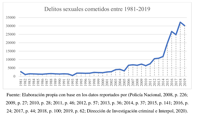 Pese al significativo incremento señalado anteriormente, este no ha sido constante pues ha habido años en que las cifras disminuyen, como es el caso de los años 1993, 2005, 2010 y 2017. Esto genera aumentos porcentuales relevantes en los años siguientes; por ejemplo, el aumento en 1994 es del 282,94%, en 2006 del 100,9%, en 2012 del 40,31% y en 2018 del 29,9%, cada uno respecto al año inmediatamente anterior. Igualmente, se observa que desde 2006, pero sobre todo a partir de 2014, las cifras se incrementan de forma importante y experimentan un descenso del 7,07% en 2017 para crecer en 29,9% en 2018 y disminuir nuevamente en un 6,25% en 2019. Estos datos muestran una tendencia marcada al aumento de delitos sexuales, particularmente después de 2010. Con relación a las cifras de violencia sexual durante el 2020, la Policía Nacional reporta 28.626 casos a nivel nacional (Policía Nacional, 2021).