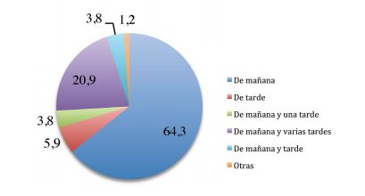 En el gráfico 1 se recoge la distribución del profesorado según la modalidad de jornada en su centro, predominando la continuada de mañana (64,3%). La segunda opción, a gran distancia porcentual (20,9%), es la jornada que distribuye las sesiones lectivas en todas las mañanas y varias tardes.