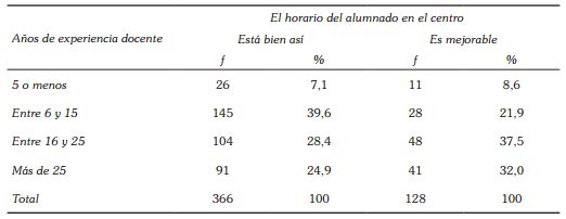 La mayoría del profesorado de la muestra (74,1%) considera adecuado el horario previsto para el alumnado y lo mantendría tal como está (ítem 8). Sin embargo, el análisis en función de los años de experiencia docente muestra diferencias significativas en esta apreciación (X2(3)=13,173; p=,004): el porcentaje de profesorado proclive a mejorar la organización horaria del centro se incrementa notablemente entre las y los más experimentados (más de 15 años de experiencia), como se recoge en la tabla 2.