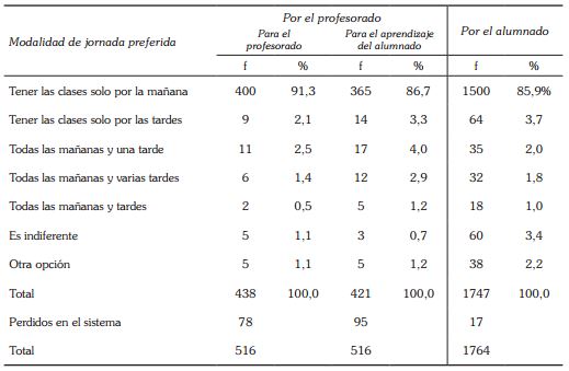 El alumnado, por su parte, señala para sí unas preferencias de modalidad de jornada muy similares a las indicadas por el profesorado. Pero es más creativo, y a veces innovador, en la propuesta de alternativas que superen la dicotomía única/ partida: «jornada continua que comience más tarde y termine después de comer » (de 10:00 a 17:00 o de 9:00 a 16:00), «con tiempo para comer»; «repartir las clases entre alguna mañana y todas las tardes» o «alternar unos días de mañana y otros de tarde»; «concentrar las clases de lunes a jueves». Se recoge, por significativa, la opinión de un/a alumno/a: «me resultaría indiferente mientras las horas estén bien aprovechadas».
