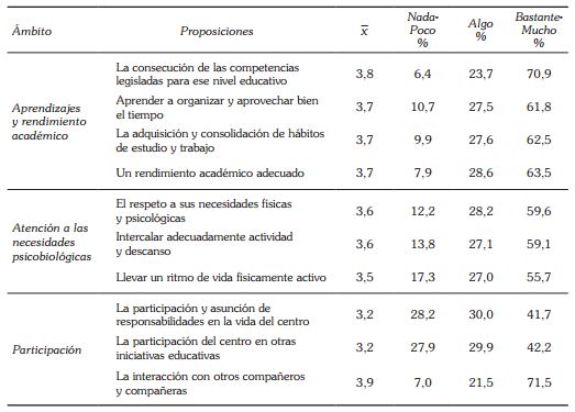 Respecto de la valoración del logro, se ofrece una visión muy optimista en relación a las capacidades legisladas y el rendimiento académico, aunque con discrepancias notables entre quien considera mejorable el horario del alumnado. No obstante, no se ocultan las dificultades para satisfacer necesidades personales del alumnado (físicas/psíquicas), sin las que difícilmente se pueden sostener los resultados expresados.