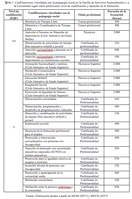 Desde el punto de vista de las cualificaciones profesionales, la pedagogía social en España se desarrolla bajo niveles diferenciados, siendo las familias de Servicios Socioculturales y a la Comunidad y Seguridad y Medio Ambiente, las que engloban, dentro de la FP, los estudios relacionados con dicha disciplina. En la tabla 1 se presenta una clasificación de las posibilidades formativas relacionadas con la pedagogía social en la familia profesional de Servicios Socioculturales y a la Comunidad —con muchas más cualificaciones asociadas que la familia de Seguridad y Medio Ambiente—, en función del nivel de cualificación establecido por el Marco Europeo de las Cualificaciones (European Qualifications Framework – de aquí en adelante, EQF) para el aprendizaje permanente (Comunidades Europeas, 2009), el título profesional al que da lugar cada una de las enseñanzas y el número de horas de formación requeridas para alcanzar la cualificación señalada [1]. Dichas cualificaciones se ubican en los dos subsistemas en los que se organiza la FP en nuestro país actualmente: la FP del sistema educativo y la FP para el empleo —englobando esta última, tanto a la formación orientada a personas desempleadas como aquella dirigida a trabajadores/as en activo.
