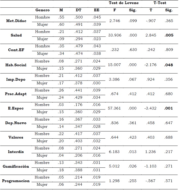 Las chicas tienen más expectativas en el aprendizaje de habilidades sociales (M= .15 vs. M=.08), coincidiendo con Murillo et al. (2014) sobre actividades cooperativas. Asimismo, muestran mayor interés por la educación especial (M=.15 vs. M=.03), algo que debería ser similar en ambos sexos (Durán & Giné, 2011) y considerado prioritario en la formación del profesorado. En cambio, los varones tienen mayores expectativas sobre salud (M=.21 vs. M=.09), coincidiendo con Castañeda et al. (2016).