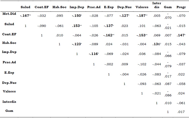 Con respecto a las correlaciones, son inversas entre métodos didácticos y salud, importancia del deporte, deportes innovadores y educación en valores.