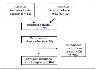Después de descargar y extraer la información de los 90 estudios, se procedió a la aplicación de los criterios de exclusión presentados anteriormente en la Tabla 2. Así pues, se eliminaron en primer lugar los trabajos duplicados en la base de datos de Web of Science, reduciendo el número de estudios a un total de 60. Después, se excluyeron también aquellos trabajos publicados en otro idioma distinto al español o al inglés; de carácter teórico al tratarse de una revisión; que no hayan sido publicados como artículos de revista; y cuyo objeto principal de estudio sea otro distinto al de la eficacia colectiva docente. Finalmente, los 35 estudios incluidos en el mapeo fueron numerados con el objetivo de facilitar su localización y favorecer el análisis de los mismos (ver Anexo 1). La Figura 2 presenta el diagrama de bloques que refleja el proceso de selección de los estudios; mientras que la Tabla 5 muestra el número de estudios descartados del mapeo sistemático según los criterios de exclusión.
