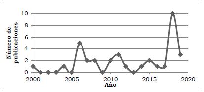 P1. ¿En qué años las bases de datos de Scopus y WoS recogen artículos de investigación sobre “collective teacher efficacy”? Los resultados obtenidos en las búsquedas fueron muy interesantes debido a que muestran claramente el momento en que el concepto de eficacia colectiva docente surgió como tal en las investigaciones. En este sentido, se puede decir que se trata de un constructo bastante reciente cuya aparición se encuentra en el año 2000 y cuyo momento de mayor auge parece ser el actual. En la Figura 3 se observa el número de publicaciones por año, ilustrando así el interés y producción de los estudios sobre la eficacia colectiva de los profesores en revistas indexadas en las bases de datos de Scopus y WoS.
