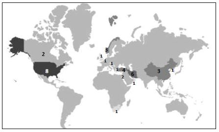 P2. ¿Cuál es la distribución geográfica de los estudios? La producción científica sobre la eficacia colectiva proviene de catorce países distintos, tal como se ilustra en la Figura 4. En la Tabla 6 se muestra el número de estudios encontrados por país. Los países que más han realizado y publicado estudios al respecto son Estados Unidos, Irán y Turquía; con ocho, seis y cuatro artículos respectivamente. Resulta llamativo el hecho de que no aparezca ningún estudio realizado en países de habla hispana y que todos los estudios incluidos en el mapeo sistemático hayan sido publicados en inglés. Lo cual refleja un cierto dominio de los países anglosajones con respecto a la temática de interés, proporcionando el 34% de los estudios incluidos.