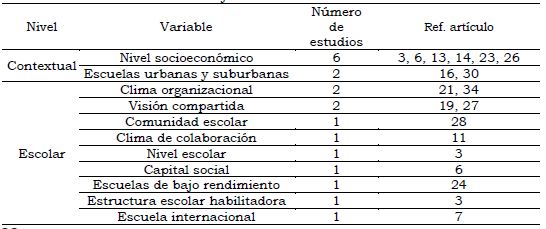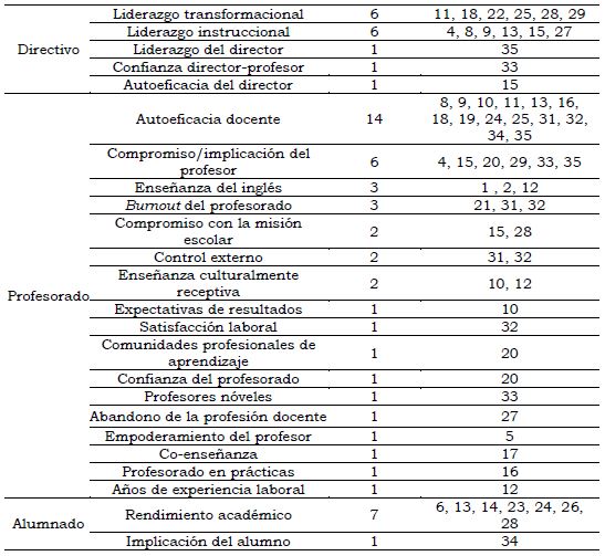 En cuanto a las variables relacionadas con la eficacia colectiva docente, se observa una clara relación entre dicho constructo y las creencias de autoeficacia de los profesores. En concreto, el 40% de los artículos incluidos estudia las creencias de eficacia a nivel individual y grupal [8, 9, 10, 11, 13, 16, 18, 19, 24, 25, 31, 32, 34, 35]. Otra variable que sobresale por su estrecha relación es la del liderazgo del director, ya sea de tipo transformacional [11, 18, 22, 25, 28, 29] o instruccional [4, 8, 9, 13, 15, 27]. Varios de estos estudios proponen la eficacia colectiva docente como variable mediadora entre el liderazgo del director y el rendimiento del alumno [13, 18, 28]; argumentando que el director impacta al alumno en la medida en que contribuye al desarrollo de las creencias de eficacia colectiva en sus profesores.