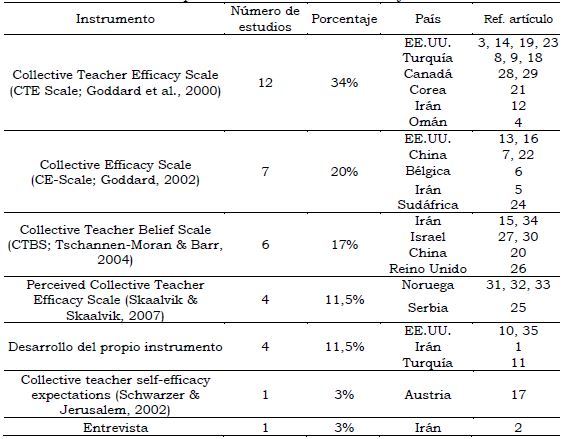 P5. ¿Qué instrumentos se utilizan para evaluar la eficacia colectiva de los profesores? La sexta pregunta de investigación busca conocer qué instrumentos han sido los más utilizados para evaluar y medir las creencias de eficacia colectiva docente. El interés por esta cuestión se debe a que cada instrumento se fundamenta en una manera determinada de concebir dicho constructo. La Tabla 10 muestra cuáles fueron los instrumentos utilizados para cada uno de los artículos incluidos en el presente mapeo.