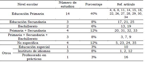 P6. ¿En qué niveles educativos se desarrollan los estudios? Otra consideración a tener en cuenta en el estudio de la eficacia colectiva docente, es el nivel educativo sobre el que se realiza la investigación. La Tabla 11 especifica los niveles escolares en los que los estudios fueron efectuados. Tal y como ahí se observa, sorprende que el 40% de los estudios incluidos en el mapeo sistemático fueron realizados con profesores de primaria.