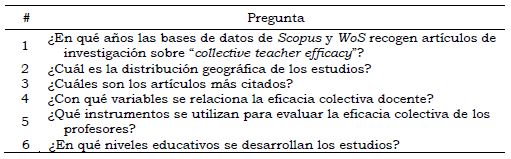 En primer lugar, se establecieron las preguntas de investigación que guiarán el presente estudio. Las preguntas son de carácter general debido a que el objetivo del mapeo sistemático es conocer las tendencias de investigación de los estudios publicados con respecto a la eficacia colectiva docente. La Tabla 1 muestra las seis preguntas de investigación.