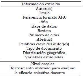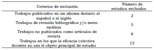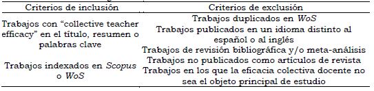 En segundo lugar, solamente se utilizó el término de “collective teacher efficacy”, dejando fuera a todos aquellos estudios que no incluyeran de manera exacta dicho constructo en su título, resumen o palabras clave. No obstante, esta última limitación nos permitió corroborar dónde y cuándo surgieron las investigaciones con dicho término para estudiar las creencias de capacidad de los profesores a nivel de centro.