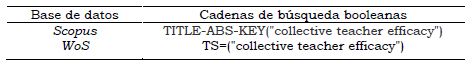 Por su parte, los términos utilizados para realizar las búsquedas se redujeron al constructo de interés, es decir, al de eficacia colectiva docente. El término fue utilizado en inglés, collective teacher efficacy, debido a que se realizó una búsqueda previa con el constructo en español y no se encontraron resultados. Así pues, con el fin de ampliar horizontes y encontrar un mayor número de estudios, se utilizaron las cadenas de búsqueda booleanas expuestas en la Tabla 3. En cuanto al periodo de tiempo comprendido en la búsqueda, no se estableció un límite en el rango de años a incluir, sino que se dejó abierto para responder mejor a la primera pregunta de investigación planteada (ver Tabla 1).