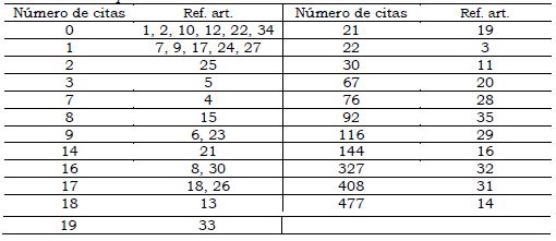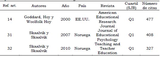 P3. ¿Cuáles son los artículos más citados? Según las bases de datos consultadas, Scopus y WoS, el 17% de los artículos no ha sido citado en otros trabajos de investigación, el 14% ha sido citado una vez y el 69% restante ha sido citado al menos dos veces. En la Tabla 7 se muestra el número de veces que cada artículo ha sido citado y en la Tabla 8 se presenta información más específica de los tres artículos más citados. Sobresale el hecho de que dos de ellos sean estudios realizados en Noruega por los autores Skaalvik y Skaalvik.