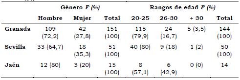 Se recogieron datos del alumnado del Máster Universitario en Profesorado de Educación Secundaria Obligatoria y Bachillerato en la especialidad de Educación Física, de las Universidades de Granada, Sevilla y Jaén, durante los cursos 2016-2017 y 2017-2018. La muestra estuvo compuesta por un total de 217 estudiantes: 154 hombres (71%) y 63 mujeres (23%), de entre 21 y 35 años, con una media de edad de 24,33 años (DT= 2,59).