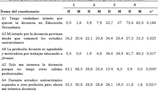 Al analizar los datos del Interés por la docencia según el género del alumnado, se recoge la idea de que la vocación docente en las mujeres es algo mayor en este caso que en los hombres, pues contemplan la docencia como opción prioritaria y como salida laboral desde el comienzo de la carrera. De hecho, se muestran incluso menos interesadas que ellos por las condiciones materiales de dicha profesión.