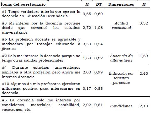 Atendiendo a las dimensiones expuestas en la tabla previa, se puede destacar por tanto la orientación del alumnado hacia una actitud vocacional por la docencia (3,32), influenciada en muchos casos por docentes que les animaron a interesarse en la profesión (2,60), a pesar de ser conscientes de las dificultades que presenta actualmente el entorno docente (2,63).