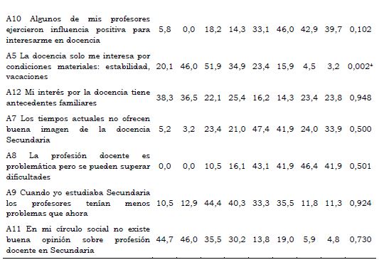 Si analizamos el Interés por la docencia en función del género del alumnado (tabla 3), se observa que solo existen diferencias significativas en los ítems A2, A4 y A5. Según estos datos, las mujeres se muestran más en desacuerdo que los hombres respecto a la afirmación “Solo me interesa la docencia porque no tengo otras salidas profesionales”, por lo que supone una salida profesional prioritaria especialmente para ellas.