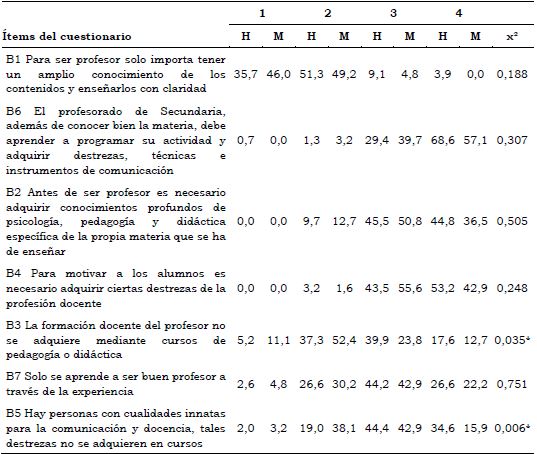 Si analizamos las Ideas previas sobre la formación docente en función del género del alumnado (tabla 5), se observa que solo existen diferencias significativas en los ítems B3 y B5. Según estos datos, los hombres conceden menor importancia a la formación a través de los cursos de pedagogía y didáctica (57,5% de los hombres están bastante y muy de acuerdo con la afirmación, frente al 36,5% de las mujeres), y mayor importancia que las mujeres a las posibles cualidades innatas que los sujetos pueden presentar para la función docente (79% de los hombres están bastante y muy de acuerdo con la afirmación, frente al 58,8% de las mujeres).