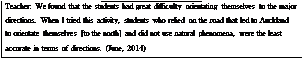 As discussed earlier, according to the elders, Māori used a variety of objects in the environment to locate themselves —such as the sun and wind (e.g., north, east, west or south of). Therefore the key teaching idea in this first activity was to introduce students to this range of possibilities for helping them to orientate themselves based on the information provided in 1999 by the elders.