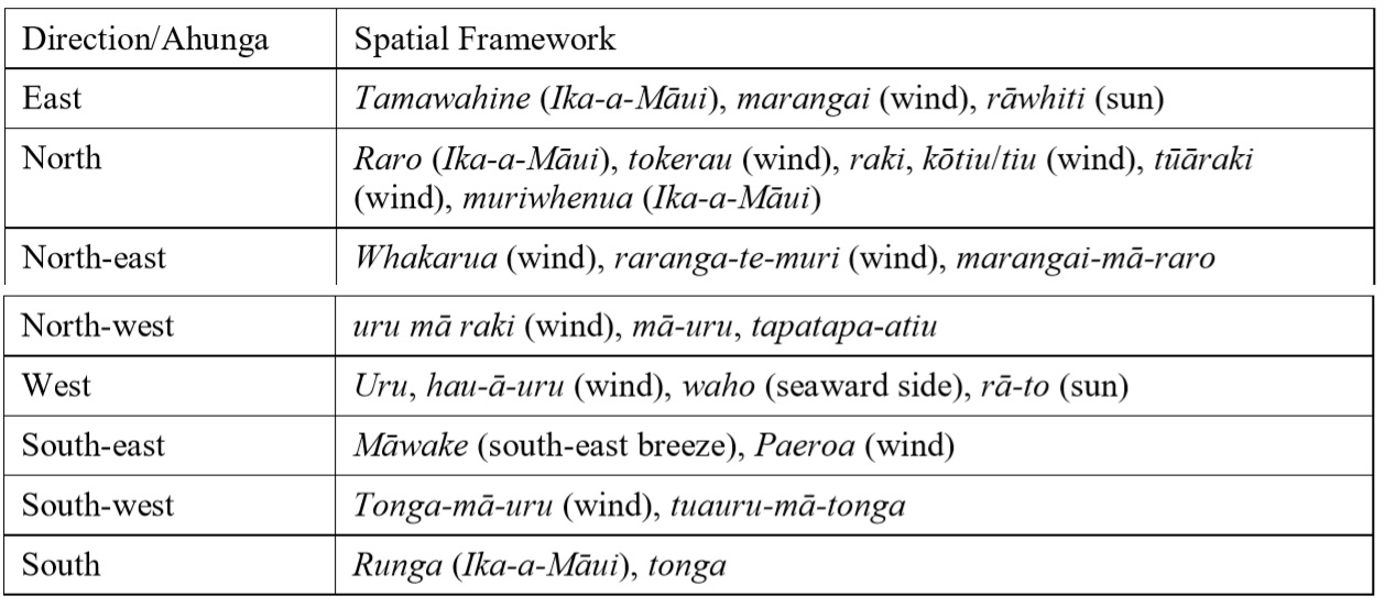 According to the information provided by the elders, Māori traditionally used a mixture of spatial frameworks, often simultaneously, to orientate themselves (Trinick, 1999). Some seemed to be generic, such as orientating to Te Ika-a-Māui, the fish outline of Aoteroa/New Zealand whereas others were very localised, such as winds. The directional terms that arise from the various frameworks are still part of the everyday Māori language but have become orientated to Western spatial frameworks such as the compass. Traditional Māori spatial frameworks also act as metaphors for important Māori cultural stories and traditions (Trinick, 1999).