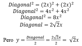 Las medidas se calculan respecto a x (altura alcanzada por el indígena con el brazo extendido verticalmente). Calculemos a y (la longitud desde un vértice del cuadrado hasta el punto donde se intersectan las diagonales), esta es equivalente a la mitad de la diagonal (ver Figura 2).